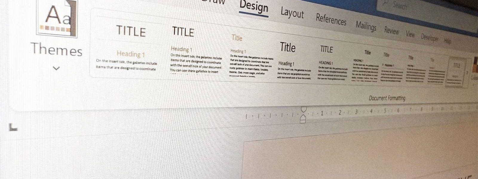 Pick the most chaotic Word file on your computer, make sure your headings use Heading 1 and Heading 2, then open the Design tab and click through the five Themes. This will help you understand the utility of the Design tab and see how much time you can save by letting Word handle formatting for you.