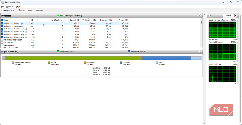 Here’s why you want to use Resource Monitor. To find which svchost.exe instance is eating your RAM, start in the Memory tab.